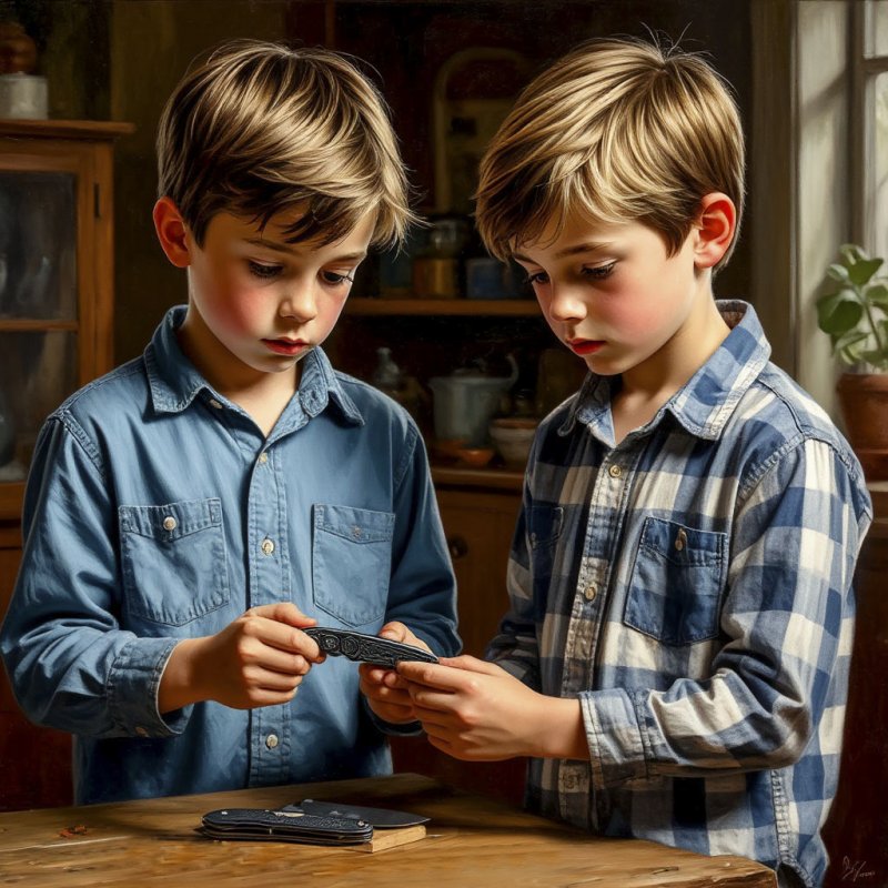 После сравнения Влад небрежно положил нож на полку — так просто, будто это была обычная вещь. Мальчики ещё играли, но Костя всё время был где-то далеко в мыслях. Влад даже заметил: