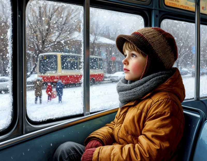 Краем глаза он заметил, как к автобусу кто-то подбегает. По ярко-розовому шарфу он сразу узнал Любу, одноклассницу. Она отчаянно старалась успеть, но двери захлопнулись прямо перед её носом, и автобус тронулся. Люба, запыхавшаяся и мокрая, стремительно уменьшалась за окном. Сева лишь грустно улыбнулся.