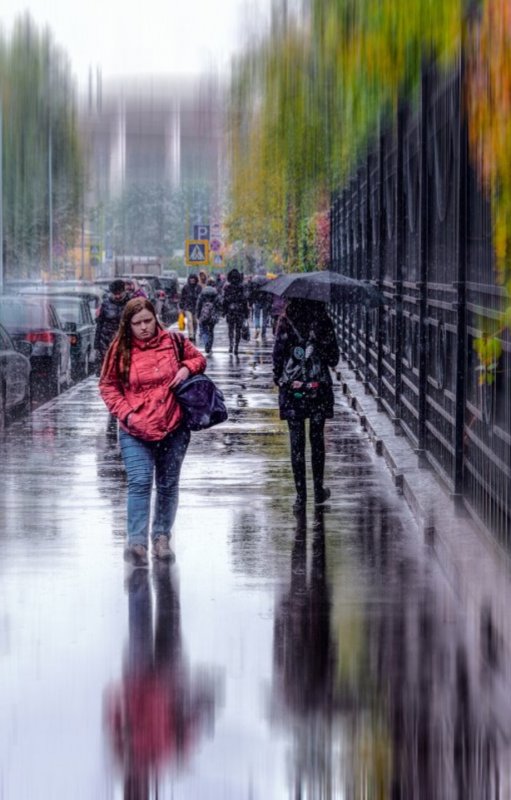 Прохожих мокрых за собой маня.